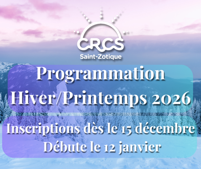 Notre programmation d’hiver/printemps 2026 est maintenant disponible. Vous pouvez vous inscrire dès le lundi 15 décembre à midi et la saison débute dès le 12 janvier.